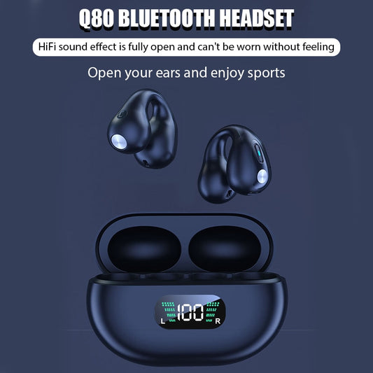 TWS Q80 Wireless Headphones Bluetooth 5.3 Bone Conduction Earphones Earclip Design Touch Control LED Earbuds Sports Headsets